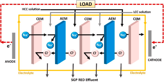 Principe de fonctionnement d’un module d'électrodialyse inverse (HCC/LCC : High/Low concentration ; SGP : salinity gradient power)